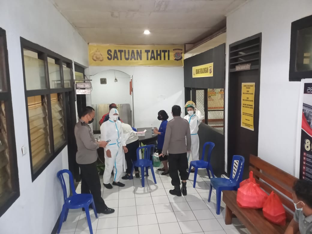 Kegiatan tes Swab bagi para penghuni ruang tahanan Polres ini, dilaksanakan oleh tim Medis Dinas Kesehatan Kabupaten Minahasa yang dipimpin Ronal Siwi.