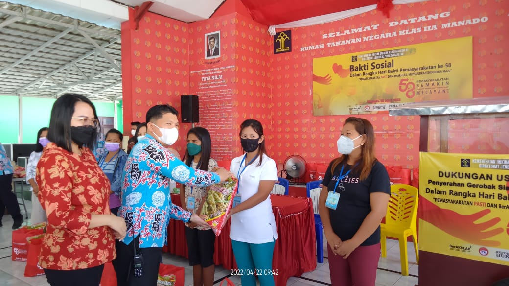Dihadiri langsung Kepala Divisi Pemasyarakatan Kanwil Kemenkumham Sulut, Kusnali bersama istri yang juga Ketua Umum Pipas, Ka Rutan Manado, Yusep Antonius bersama Ketua Dharma Wanita Persatuan Rutan Manado, diserahkan bantuan paket sembako buat 22 warga sekitar Rutan, dan bantuan UMKM berupa satu buah gerobak.
