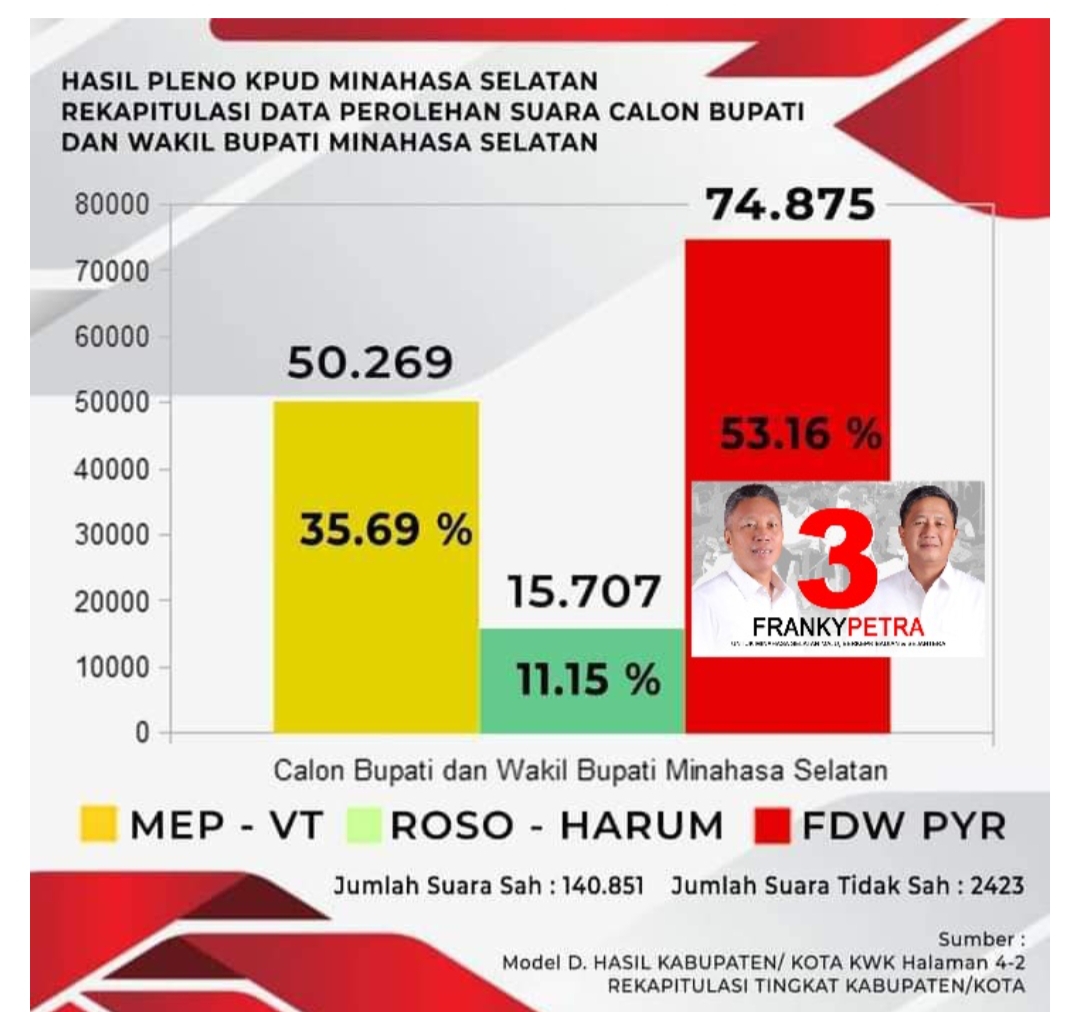 Dari hasil rekapitulasi, Paslon Franky Donny Wongkar-Petra Yani Rembang (FDW-PYR) keluar sebagai jawara Pilkada Minsel. Dengan demikian, FDW-PYR menjadi Bupati dan Wakil Bupati pilihan rakyat Minahasa Selatan. Perolehan suara FDW-PYR sukses meninggalkan jauh dua paslon lain dengan selisih suara signifikan.