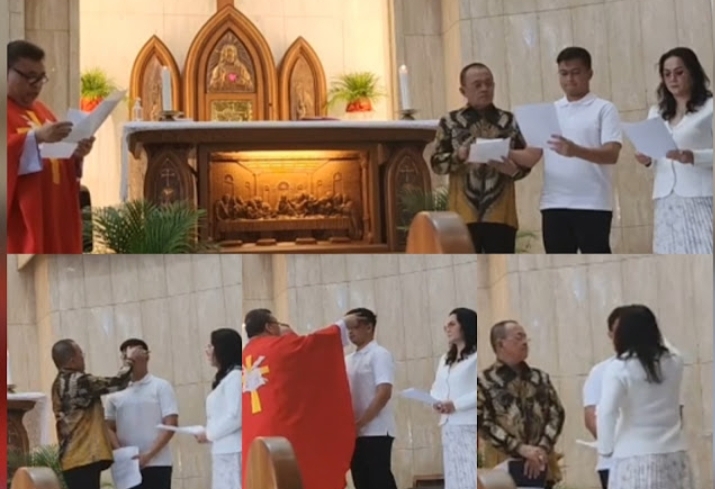 Chris Purba diterima dalam Gereja Katolik, disela perayaan Misa Kudus yang dipimpin Pastor Berti Tiwow, MSC, di Gereja Policarpus, Grogol, Jakarta Barat, Minggu (24/03/2024).
