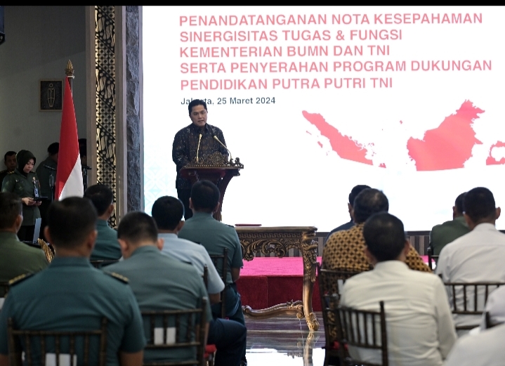 “Untuk itu sinergitas ini menjadi sangat penting guna merealisasikan pembangunan nasional BUMN dengan dukungan yang diberikan oleh TNI melalui pengamanan aset BUMN yang tersebar luas di wilayah Indonesia. serta melindungi objek-objek vital nasional yang ada di seluruh wilayah NKRI,” kata Erick.