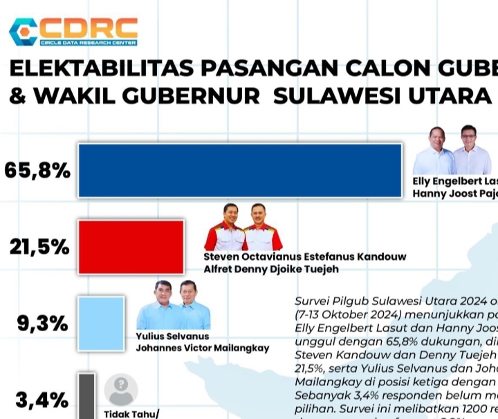 Itu karena Paslon Engelbert Lasut-Hanny Joost Pajouw atau E2L-HJP unggul 65,8 persen dalam survei terbaru yang dilakukan Circle Data Research Center (CDRC).