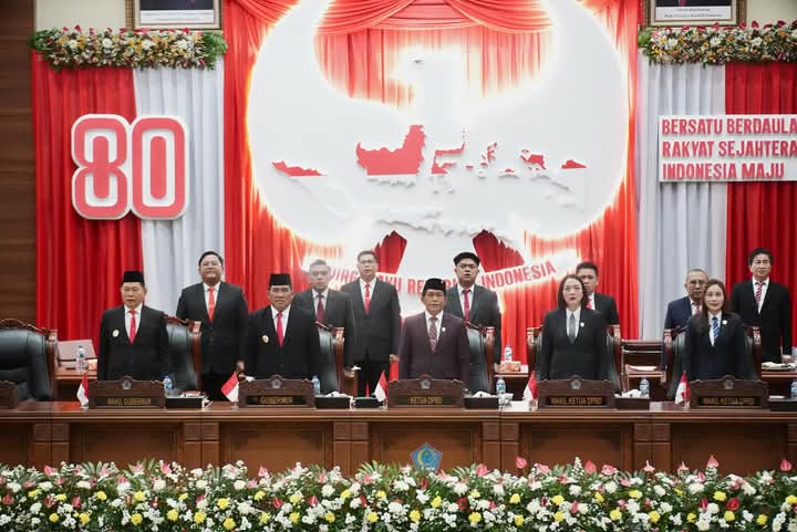 Pidato kenegaraan oleh Presiden Prabowo didengarkan dalam Sidang Tahunan MPR RI dan Sidang Bersama DPR-DPD RI dalam rangka HUT ke 80 Kemerdekaan RI di Ruang Rapat Paripurna DPRD Provinsi Sulut.