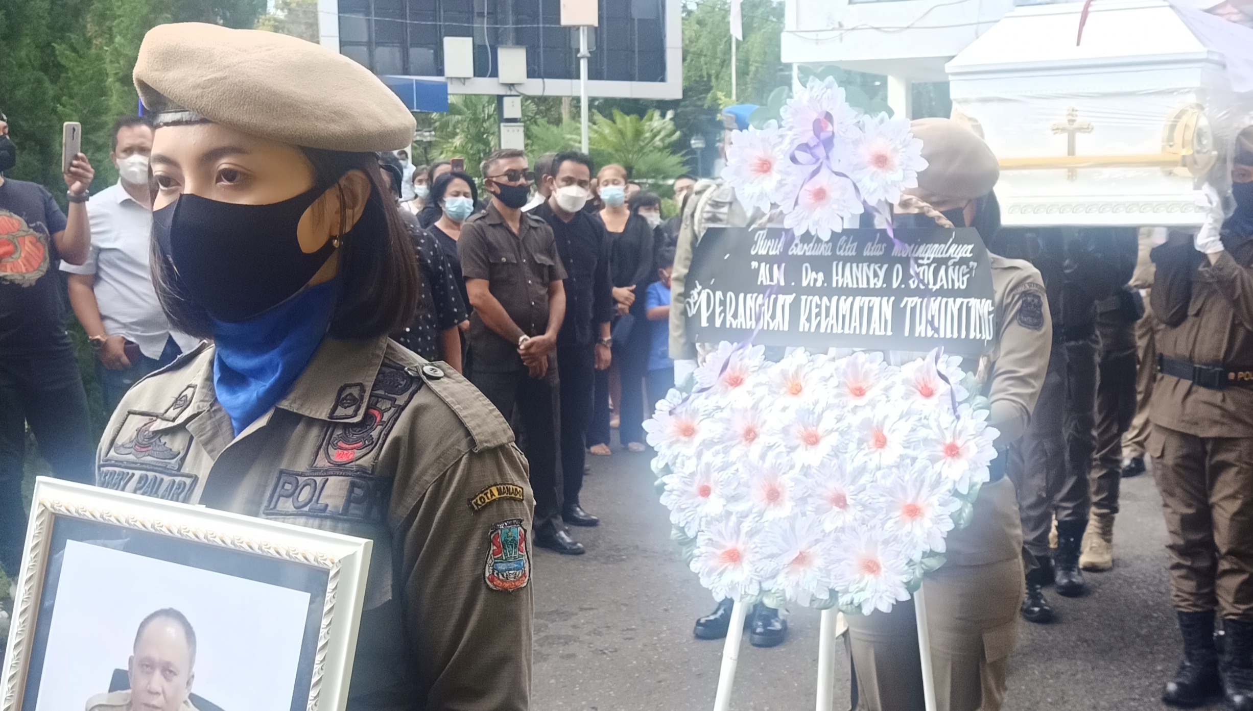 Manado, SwaraKawanua.ID-Jenasah Kepala Badan (Kaban) Kesbangpol Pemkot Manado, Hanny Solang disemayamkan di kantor Pemkot Manado, Senin (01/02/2021) sekitar pukul 15.00 Wita. Rombongan Jenazah tiba di Pemkot Manado dijemput oleh Satuan Polisi Pamong Praja Kota Manado.