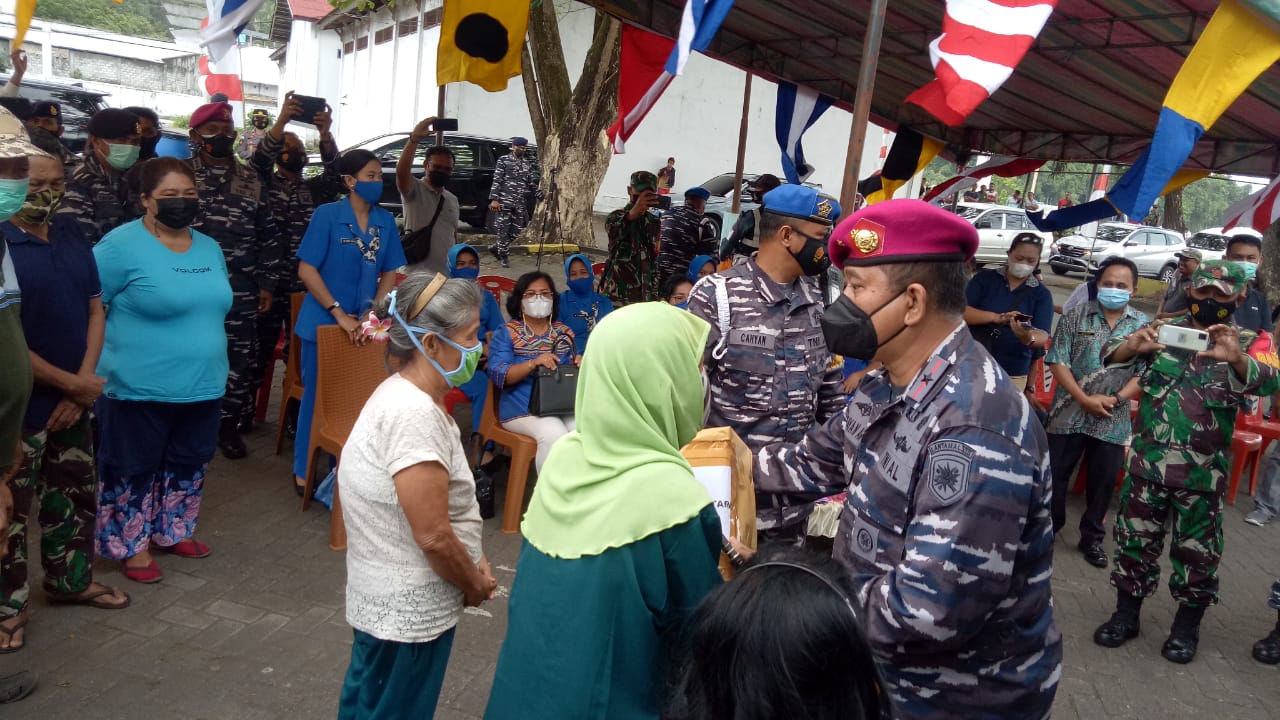 CAPTION FOTO: Danlantamal VIII Manado Saat Menyerahkan Bantuan Sembako ke Warga. (*).