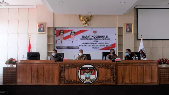 Amurang, Swarakawanua.ID- Rapat kordinasi pemerintah kabupaten Minahasa Selatan dengan Badan Kerja Sama Antar Umat Beragama (BKSAUA) dan Forum Kerukunan Umat Beragama (FKUB) bersama Wakil Bupati serta unsur Forkopimda, Selasa (06/04/2021) bertempat di ruangan rapat lantai IV kantor bupati Minsel.