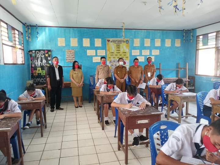 Dalam pelaksanaan ujian akhir sekolah di hari kedua Wakil Bupati Minahasa Selatan Pdt Petra Yanni Rembang MTH bersama dengan kepala dinas pendidikan kabupaten Minahasa Selatan melakukan monitoring kesiapan pelaksanaan ujian akhir sekolah di sekolah tersebut.